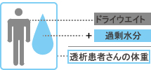 尿量が少ないあるいは全くない透析患者さんでは、摂取する水分量に十分注意する必要があります。水分を取りすぎると心臓への負担が増えます。透析終了時の目標体重を「ドライウエイト」と呼びますが、ドライウエイトは体内に過剰水分がないときの体重で、血圧や胸のレントゲンを参考にしながら医師が決めます。患者さんの栄養状態や血圧などに応じて、定期的に見直します。